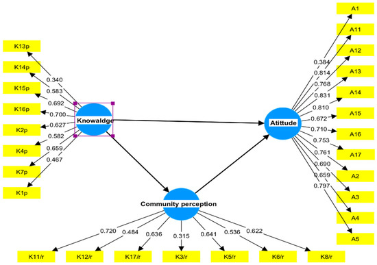 A pilot test was carried out with 40 participants to evaluate both the construct validity and reliability of the questionnaire and reliability using Smart PLS software version 4 (Smart PLS GmbH, Gewerbering 8, Tostedt, Germany, 2022). The partial least squares structural equation modeling (PLS-SEM) technique was used to estimate the factor loadings for each domain, to examine the validity (convergent and discernment) and reliability (internal consistency) of the questionnaire components. All components displayed composite reliability and a Cronbach’s alpha value greater than 0.7 when measured with the measurement model in Figure 1, indicating the questionnaire’s reliability (Supplementary File, Table S2). The average variance extracted (AVE) values of all constructs exceeded 0.5, showing convergent validity. The Fornell and Larker criteria were used to verify discriminant validity (Supplementary File, Table S3). Consistent PLS-SEM bootstrapping was used to test approximate model fit, yielding a standardized root mean square residual (SRMR) value of less than 0.1 (0.087; 95% confidence interval (CI): 0.056–0.190), indicating an acceptable model fit.