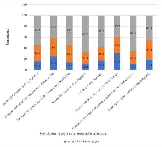 The first section focused on demographics (age, gender, marital status, educational level, socioeconomic status, and place of residence). The second section contained seven questions aiming to assess the participants’ depth of knowledge about the risk factors for GUMs or defects in children. The third section also included seven questions designed to assess the participants’ incorrect perceptions regarding the risk factors for developing GUMs. The fourth section contained questions to assess the participants’ attitudes towards GUM prevention. Bloom’s cut-off points were used to determine the overall outcome measures (to categorize the degree of knowledge, perceptions and attitudes) as follows: