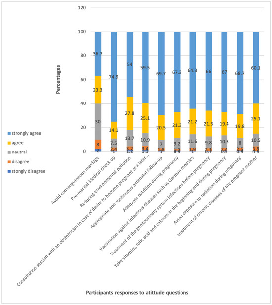 A prevailing consensus indicated that adequate prenatal follow-ups, premarital medical examinations, and nutrition could facilitate enhancement. Most of the respondents had encouraging overall attitudes, while few were neutral. In both univariate and multivariable analysis, demographics were not found to be associated with attitude scores. A total of 74%, 69%, and 67%, respectively, strongly agreed on the need for proper and ongoing prenatal follow-ups, premarital medical check-ups, and optimal nutrition throughout pregnancy (Figure 4). A total of 83% of respondents had positive overall attitudes, with 13% having neutral attitudes (Table 2). In both univariate and multivariable analyses, there was no association between demographics and attitude scores (Table 5).