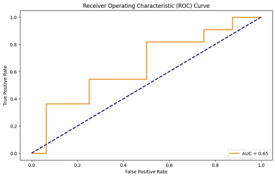 In our study, the performance of LR models built for predicting LBP, KP, and NP was assessed using the different parameters of evaluation metrics, including the area under the receiver operating characteristic curve (AUC). For the NP model, the hyperparameters found after the grid search did not provide the best values for the parameters of the evaluation metrics. Instead, default hyperparameters were used to build the satisfactory model (Table 5). The class weighting parameter was used in the case of the NP model to ensure no bias towards the majority class and effective learning from the minority class. It is performed to balance the importance of both classes. Figure 3, Figure 4 and Figure 5 show ROC curves (AUC) of LBP, KP, and NP, which are used as a measure of model discrimination. AUC values of 0.65 for both LBP and KP reveal that the LR models demonstrated moderate discriminative ability in identifying subjects with or without these MSDs (Table 6). However, for NP, the model provides an AUC of 0.47, which indicates below-average discriminative ability in accurately predicting the subjects who suffered from NP than those who did not. It is noticeable that even with the use of improvement techniques such as the class weighting parameter, which may help improve the prediction of less frequent outcomes, and regularization techniques to prevent overfitting and generalizability, the evaluation metrics still only show moderate performance, especially for neck pain prediction. This may be due to the fact that some risk factors for MSDs, such as posture, ergonomic conditions, or psychosocial factors like stress, were not included in the present data. These factors may have some role in causing neck pain, which is often a result of the combination of lifestyle and work-related influences. Furthermore, linear models like logistic regression are, at times, unable to adequately reflect the complexity of the interactions between risk variables and MSDs.