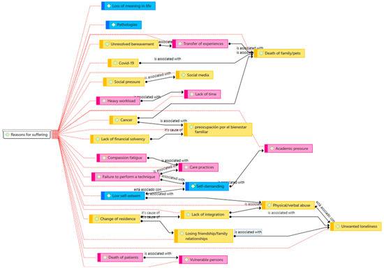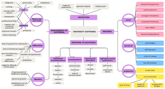 The suffering experienced by a person is constructed according to multiple dimensions pertaining to the body, temperament, emotional education, coping style, background, culture, family, previous experiences, and social networks together with a dimension that pertains to the internal life elements that make individuals unique and include one’s dreams, values, beliefs, hopes, memories, and fears. Further, suffering is related to the severity of affliction [35]; however, in this case, severity is determined through assessment of the importance of the problem or the way in which it stops one from being themselves. This standpoint coincides with that proposed by informants in the present study and by other previous research [36], which reveals that the main reasons underlying suffering in the lives of university students pertain to the social, personal, and academic situations they face, depicting complex personal lived reality according to the level of threat they perceive to themselves.