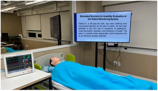 The test environment, as depicted in Figure 4, was organized to resemble an intensive care unit using the patient monitoring system. The setup included a patient bed, a patient dummy, and a nursing station, all arranged to closely resemble a real intensive care unit. Temperature and humidity levels in the evaluation room were measured and recorded immediately prior to the evaluation. Consistent with conditions in a typical intensive care unit, the temperature was maintained between 21 °C and 24 °C, and the humidity was kept between 30% and 60%.