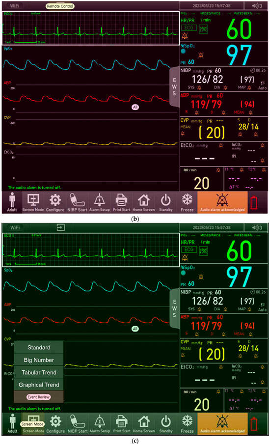 Patient monitoring devices are typically organized into waveform and parameter areas, and they often include a menu button for navigation [1,6]. For example, as shown in Figure 1, the M50 Patient Monitor is equipped to provide a comprehensive array of measurements, including the electrocardiogram (ECG), heart rate (HR), non-invasive blood pressure (NIBP), oxygen saturation (SpO2), pulse rate, respiration rate, temperature, capnography (EtCO2 and InCO2), invasive blood pressure (IBP), multi-gas analysis, and bispectral index (BIS). Its 15-inch touch screen enhances the visibility and ease of use for medical personnel, while the built-in battery ensures functionality even during patient transport or power outages. These features collectively contribute to the device’s effectiveness in high-stake medical environments. The device’s graphical user interface enables the simultaneous display of four to seven waveforms within the waveform area.