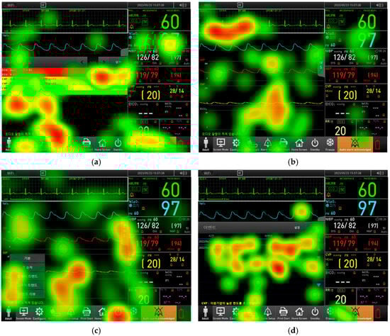 Figure 7 portrays representative gaze pattern data shown in heatmap form for low success tasks. Figure 7a presents the gaze data for Task 25, which was a critical task. Our analysis revealed that participants who failed this task predominantly focused on the alarm messages within the message list window. Despite the presence of the “Alarm Pause” button, they did not recognize the option to delete the arrhythmia alarm, as evidenced by the heatmap.