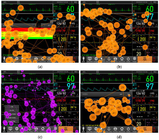 For Task 27, although the task success rate was relatively low at 59.09%, the satisfaction score was high, at 4.68 (0.55). This indicates that, while the task success rate was suboptimal, participants reported high satisfaction with the overall user interface. The eye-tracking results revealed that participants did not recognize the method for accessing the event review through the screen mode button. Participants briefly looked at the event review area after pressing the screen mode button but did not seem to recognize its functionality. As shown in Figure 8c, the gaze plot revealed that participants fixated on the Event Review menu tab three times but still failed to locate it. Instead, their gaze was primarily directed toward the EWS (Early Warning Score) menu tab. Unlike the Event Review menu, the EWS menu is designed to predict and identify potential risks by analyzing parameter values in advance. Discussions with healthcare professionals regarding the tendency to focus on the EWS menu revealed that the Event Review menu was not visible on the main screen. Additionally, the proximity of the EWS menu to the waveform area led participants to mistakenly perceive it as the tab for reviewing events. This discrepancy suggests that, while users were generally satisfied with the event review window itself, the method for accessing it differed from other devices they had used, contributing to the lower task success rate. To improve usability and accessibility, it is recommended to add a review button to the bottom menu of the main screen. This change would enhance accessibility and streamline the user experience, particularly in intensive care units where the continuous monitoring of critically ill patients is essential. Given the need for frequent and quick access to patient status trends, having a review button readily available on the main screen would facilitate easier and faster access.