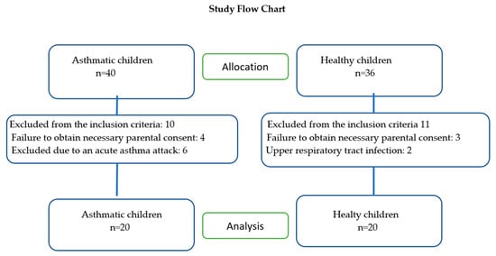 In this cross-sectional study, 20 asthmatic children under routine follow-up directed by the Hacettepe University Department of Pediatrics, Allergy and Asthma Unit, and 20 healthy children who volunteered to participate were included (Figure 1). The inclusion criteria for asthmatic children were that they be 6–11 years of age, diagnosed with childhood asthma based on Global Initiative for Asthma (GINA) guideline diagnostic criteria [], clinically stable and not in an active asthma attack, approved for informed consent signed by parents or legal guardians, and cooperative with tests. The exclusion criteria for the patient group were having an asthma attack or being admitted or hospitalized in the last three months due to an asthma attack; serious diseases, such as cancers, heart failure, acute respiratory tract infections, chronic lung disease other than asthma, and severe neuromuscular and musculoskeletal problems; and being uncooperative to participate in the tests. The inclusion criteria for healthy children were that they be 6–11 years of age; without any chronic disease or a mental, neurological, orthopedic, cardiovascular, or pulmonary problem that would prevent physical activity; cooperative; able to volunteer to participate in this study; and able to have the free and informed consent form signed by their parents or legal guardians to allow the child to participate in this study.