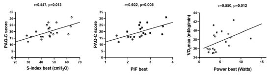 There was a low and a moderate significant positive relationship between theS-index avg (r = 0.498, p < 0.025) and S-index best values and the PAQ-C score (r = 0.547, p < 0.013). Dynamic inspiratory muscle strength increased and the PAL increased. There was a low and a moderate significant positive correlation between the PIF-avg (r = 0.490, p < 0.028) and PIF-best values and the PAQ-C score (r = 0.602, p < 0.005) (Table 4, Figure 2).