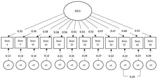 Next, CFA was used to test the one-dimensional structure of the HLS19-Q12 determined by EFA. The results of the CFA were close to acceptable values of model fit: CFI = 0.89, TLI = 0.88, NFI = 0.89, RMSEA = 0.06. The inspection of the modification indices suggested that it induced a correlated error from item 37 to item 42. Hereby, a re-specified 12-item model increased all model fit indices: CFI = 0.93, TLI = 0.91, NFI = 0.90, RMSEA = 0.05 (0.04–0.06) (Figure 1). Figure 1 shows the resulting structural model.