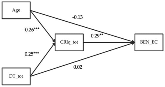 We found that BEN_EC was directly predicted by neither age nor DT_tot. However, it was positively predicted by the total CR score; both predictors are significantly related to CRI_tot. Moreover, interestingly, both indirect effects of age and DT, through the mediation of CRIq_tot on BEN_EC, were significant.