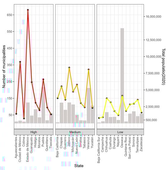 According to the 2020 Population and Housing Census conducted by the National Institute of Statistics and Geography (INEGI), the population density in México was 64 inhabitants per square kilometer (hab/km2) [32]. The INEGI categorizes the 32 Federal Entities as high, medium, or low population density (Figure 1).
