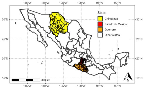 The figures were created using the INEGI’s shapefiles (https://www.inegi.org.mx/app/biblioteca/ficha.html?upc=889463807469 (accessed on 26 November 2021)), which are freely available for academic use and other non-commercial uses [46].