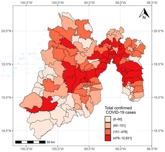 As of 24 November 2021, 176,268 confirmed cases of COVID-19 were registered in the State of México. The municipalities with more than 10,000 cases were located in the east and center of the state: Ecatepec de Morelos (22,613 cases), Nezahualcóyotl (16,992 cases), Toluca (13,647 cases), Naucalpan de Juárez (12,450), and Tlalneplantla de Baz (10,605 cases). The municipalities with less than 20 cases were located in the southeast of the state, including Zacazonapan (18 cases), Ixtapan del Oro (14 cases), and Otzoloapan (12 cases) (Figure 3).