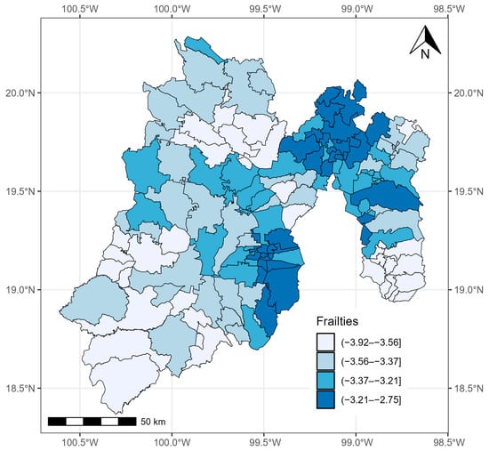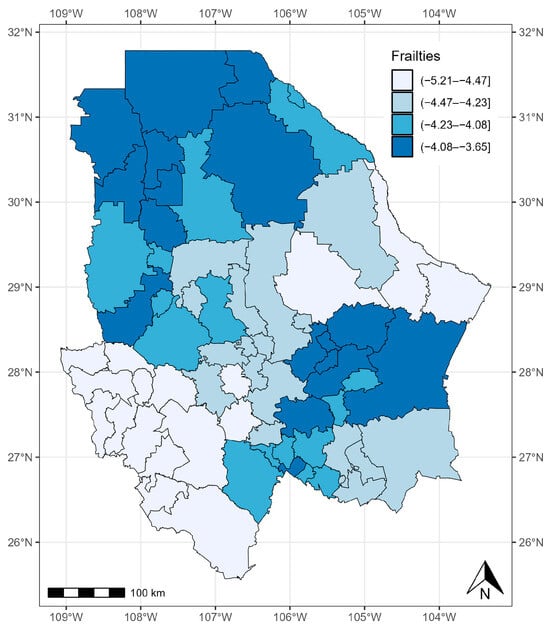 The variance of () was significant, with a 95% CrI of 1.221–3.706 (Table 4). The random effect had an influence, which means that the risk of COVID-19 was not homogeneous across the 67 municipalities of the state of Chihuahua. In general, the municipalities with the most cases of COVID-19 presented larger values of . This was the case for the municipalities in the north and southeast of the state of Chihuahua, which had the highest risk of mortality adjusted for the effects of covariates (Figure 8).