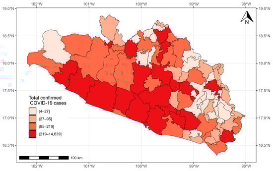 As of 24 November 2021, 37,278 confirmed cases of COVID-19 were registered in Guerrero. The municipalities with more than 1000 cases were located in the south, center, and north of the state: Acapulco de Juárez (14,639 cases), Chilpancingo de los Bravo (6773 cases), Zihuatanejo de Azueta (1984 cases), Iguala de la Independencia (1664 cases), and Taxco de Alarcon (1007 cases). The municipalities with the fewest cases were located in the east and north of the state: General Canuto A. Neri (nine cases), Atlamajalcingo del Monte (eight cases), Tlacoapa (six cases), Pedro Ascencio Alquisiras (four cases), and Iliatenco (four cases) (Figure 5).
