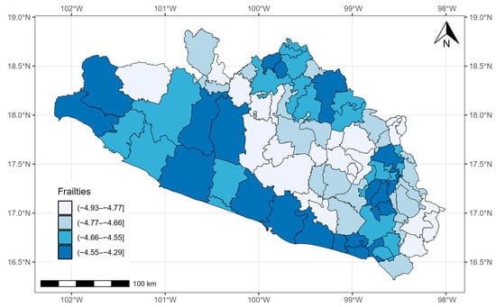 Figure 4 shows the average values of posterior sampling for frailties (). We can identify clusters of municipalities. The inhabitants of the eastern municipalities had the highest risk of mortality adjusted for the effects of covariates.