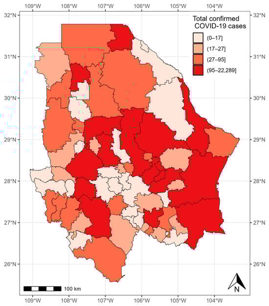 As of 24 November 2021, 45,954 confirmed COVID-19 cases were registered in the state of Chihuahua. The municipalities with more than 1000 cases were located in the central and eastern parts of the state: Chihuahua (12,582 cases), Delicias (1842 cases), Hidalgo del Parral (1750 cases), and Cuauhtémoc (1687 cases). The municipalities with less than five cases were located in the west of the state: Matachí (three cases), Huejotitlán (two cases), and Maguarichi (one case) (Figure 7).