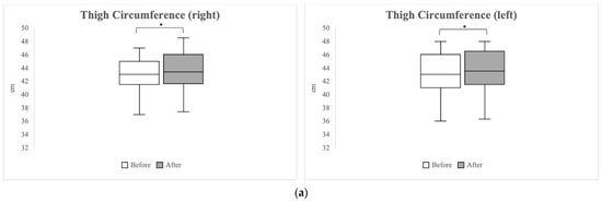 Changes in thigh (a) and calf circumference (b) after the 2-week blood flow restriction exercise program. Asterisks (*) indicate p-values < 0.05, denoting statistical significance.