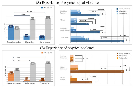 Figure 1 shows the frequency of psychological and physical violence experienced by workers in their workplace. Over half of the personal care workers (53.3%) reported experiencing some form of psychological violence in the past month, a significantly higher percentage than office workers (17.3%, p < 0.0001) and service workers (14.7%, p < 0.0001). The types of psychological violence experienced by personal care workers included humiliating behaviors (24.7%), threats (16.0%), unwanted sexual attention (25.3%), and verbal abuse (45.3%). The frequency of each type of psychological violence experienced by personal care workers was significantly higher than that experienced by office or service workers (all p-values < 0.05).