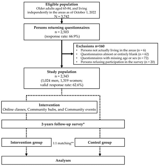 Study flow diagram. * Participants will be categorized into either the intervention or control group based on their response in the follow-up survey regarding prior participation in any of the interventions. ** Propensity score matching with a ratio of 1:1 between the intervention and control groups will be applied using logistic regression based on the baseline survey.