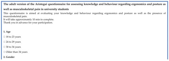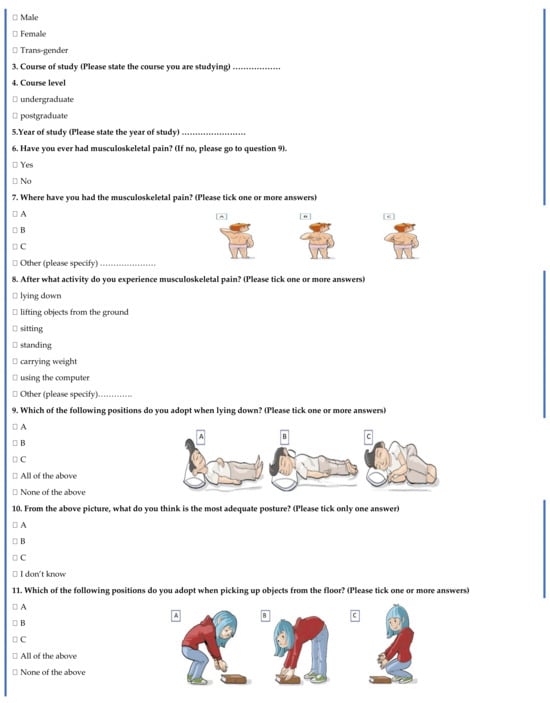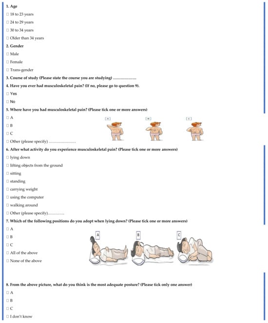 The research team also agreed to include open-ended questions to assess whether or not the participants have an in-depth understanding or they had just guessed the answer. The researchers added the options “other pain” to the question on the presence of musculoskeletal pain, “all of the above” and “none of the above” to the questions about postural behaviour and “I don’t know” to the close-ended questions inquiring about knowledge of ergonomics and posture.