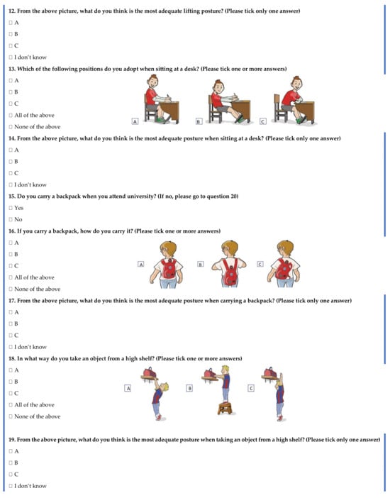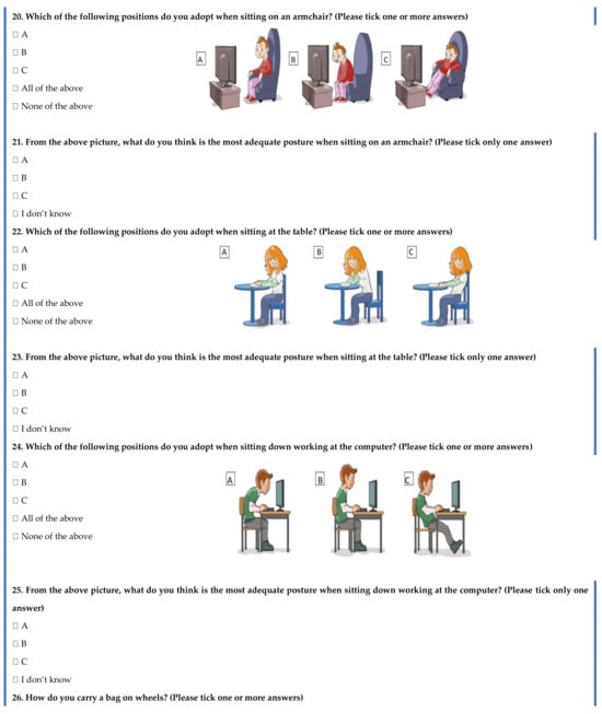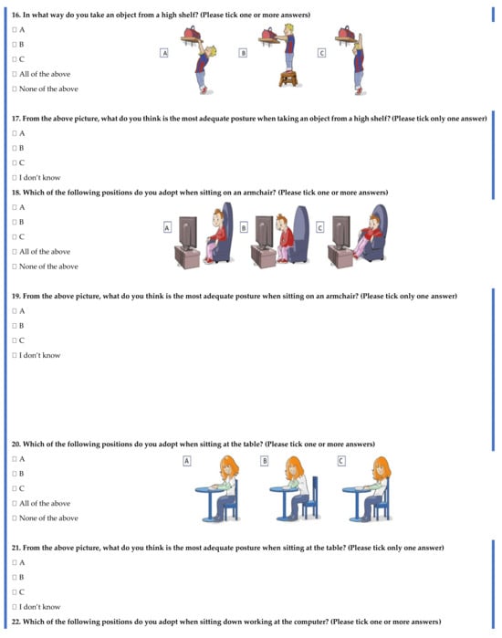 Following an extensive literature review, the child version of the Aristegui questionnaire was considered to be the most appropriate instrument to measure knowledge of ergonomics, posture and postural behaviour in young adults. This 21-item questionnaire was designed with attractive illustrations in an attempt to make the items easier to understand and increase the response rate. Originally, Aristegui [29] designed the tool for schoolchildren aged 8–10 years old. Following the relevant permissions from Aristegui [29] to use these questions, the research team (researcher and 2 supervisors) slightly amended the questionnaire to make it more suitable for university students (adult version) (see Figure 1).