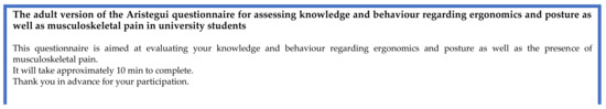 To the researchers’ knowledge, none of the available questionnaires listed above can be considered to be valid instruments for measuring knowledge regarding ergonomics, posture and postural behaviour in university students. However, the child version of the Aristegui questionnaire was specifically related to knowledge regarding ergonomics and posture as well as postural behaviour, illustrated with images, which was highly original. Thus, the Aristegui tool (child version) was considered to be the most appropriate instrument to evaluate the knowledge regarding ergonomics and posture as well as postural behaviour in university students.