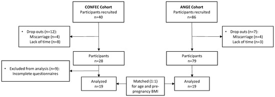 For the present study, we only included individuals from the CONFEC cohort who had successfully completed all the questionnaires outlined in the following sections (n = 19). Pregnant individuals from the CONFEC cohort were individually matched (1:1) for pre-pregnancy BMI and age, with the best match available from the ANGE cohort. After the matching process, the average differences observed between the pairs were 0.26 ± 1.18 kg/m2 for pre-pregnancy BMI and 0.38 ± 4.35 years for age (Figure 1). The final sample includes 19 participants in each group.