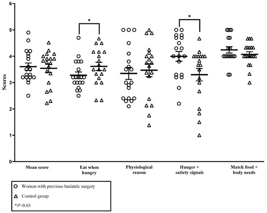Our study highlighted that pregnant individuals with bariatric surgery have a higher score for reliance on internal hunger and satiety cues but a lower score for unconditional permission to eat than individuals without bariatric surgery. These results partially contradict our hypothesis that pregnant individuals with bariatric surgery are more intuitive when compared to pregnant individuals without bariatric surgery. First, to explain why pregnant individuals with bariatric surgery have higher score for reliance on internal hunger and satiety cues, we suggest that this may be related to the nutritional follow-up of these participants. Indeed, in order to minimize the risks of deficiencies and achieve adequate GWG, post bariatric surgery pregnant individuals are often guided and encouraged, throughout their pregnancy, to adopt a balanced diet specific to bariatric surgery and being attentive to their internal signals [15,39]. Second, changes in the gastrointestinal tract mean that certain foods are less tolerated or even discouraged to optimize intake and reduce the risk of inconvenience and/or discomfort [3]. This could thus explain why individuals who have undergone surgery do not have a high score for unconditional permission to eat. In brief, differences between pregnant individuals with and without bariatric surgery regarding intuitive eating were observed in this study, which could be explained by physiological changes and/or by the closer nutritional monitoring received throughout their pregnancy.