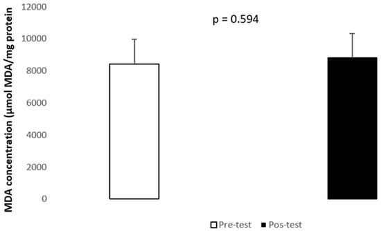 Quantification of MDA, as biomarker of oxidative stress. Mean (±SD) MDA concentration in the participants before (1) (□) and after (2) (■) the 8-week training period.