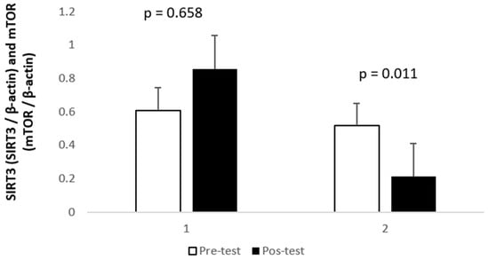 Relative quantification of SIRT3 (1) and mTOR (2) levels in lymphocytes, as denoted. See methods for details; mean (±SD) measured in lymphocytes of blood samples collected in the participants before (□) and after (■) the 8-week training period.