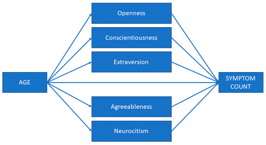 We performed the first mediation analysis with age as a predictor, the Big Five dimensions as mediators, and symptom count as an outcome.