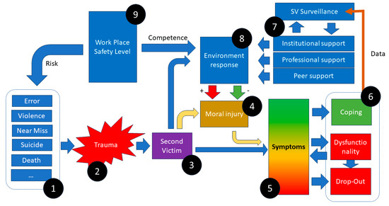 Working in complex medical environments exposes healthcare providers (HCPs) to the risk of emotional traumatization. Predominantly, though not exclusively, following medical errors, the experience of guilt and shame in responsible or extreme situations may trigger the onset of a second victim phenomenon (SVP) [1,2,3,4,5]. The European Researchers‘ Network Working on Second Victims (SVs) defines this phenomenon as “Any healthcare worker, directly or indirectly involved in an unanticipated adverse patient event, unintentional healthcare error, or patient injury, and who becomes victimized in the sense that they are also negatively impacted” [4]. SVP is known to cause severe reactions in HCPs and may lead to absenteeism, post-traumatic stress disorder (PTSD), depression, and even suicide [6]. On an institutional level, SVs who cannot cope with the situation may leave their institutions, the medical system as a whole, or work in a dysfunctional manner [7], causing further harm to patients and institutions, e.g., by practicing defensive medicine [8,9,10,11]. Consequently, the role of institutional support in prevention and intervention, especially in developing and maintaining safety culture, is crucial [12].