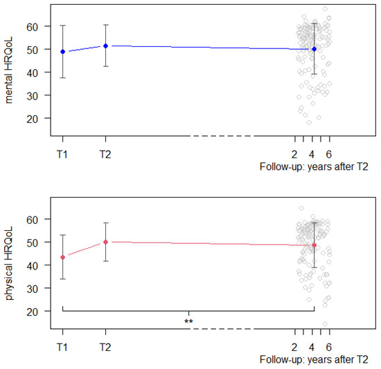 From CR entry (T1) to CR discharge (T2), physical (t = −5.66, p < 0.001) and mental (t = −2.06, p = 0.040) HRQoL improved significantly. In both HRQoL subdomains, the improvements remained stable until follow-up. Figure 1 depicts the mean scores of mental and physical HRQoL at the three measurement points (Figure S2 in Supplementary Materials provides additional information on changes in HRQoL in the eight subdomains of the SF-36 survey over time).
