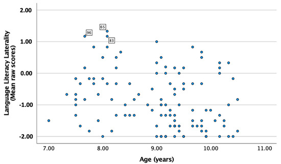 Associations with age were investigated. In the DPD group, Pearson’s correlation analysis showed only one significant correlation with weak strength, namely between age and the LLL subscale (r = −0.25, p = 0.008); see Figure 2. Three of these children (two 7-year-olds and one 8-year-old, case numbers 65, 83, and 96) showed tendencies to be outliers as they were the only children who had scores > 1 (=agree). These scores were therefore removed from the analysis. This resulted in a weaker but still significant correlation with age (r = −0.19, p = 0.04). Thus, younger children were reported with higher LLL scores. Corresponding analysis for the TD group showed no significant associations with age.