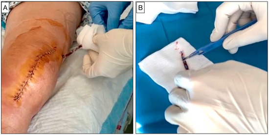 (A) The removal of the surgical drain on the first day after TKA surgery performed in a sterile and standardized manner. (B) Surgical drain tip section on a sterile surface.