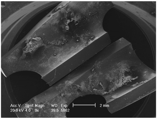 The samples intended for SEM analysis were fixed in 2.5% glutaraldehyde (MERCK, Rahway, NJ, USA) in 0.1M sodium cacodylate buffer (Sigma, St. Louis, MO, USA, C-0250) for 1 h and then rinsed with 0.1 M sodium cacodylate buffer solution. After osmium tetroxide (Electron Microscopy Sciences, Hatfield, PA USA) fixation, another cacodylate buffer washing was performed and complete dehydration was achieved in graded alcohol series and hexamethyldisilane. The samples were then mounted on aluminum stubs, gold-sputtered, and observed with an SEM Philips XL 20 (FEI, Milan, Italy) at an accelerating voltage of 20 kV at 1500, 2000, and 4000 magnification (Figure 2). The degree of biofilm formation was determined using a semi-quantitative grading scale (Table 1 and Figure 3, Figure 4, Figure 5 and Figure 6). For the SEM analysis, the samples were longitudinally cut in half and both surfaces were observed. From each patient, five different images were taken at 500× magnification. Two reviewers (MMB and CL) independently reviewed all scans, and differences were resolved by a third reviewer (AG), who independently reviewed all cases of disagreement.