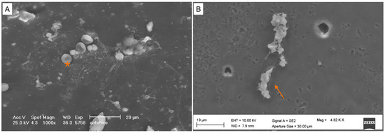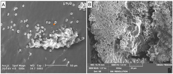 Partially mature biofilm (covering < 50% of the specimen surface). (A) Bacterial cells are arranged in a cluster, with extracellular matrix in the background. (B) High magnification. Bacterial cells are arranged in a cluster (orange arrow). Red blood cells (*).