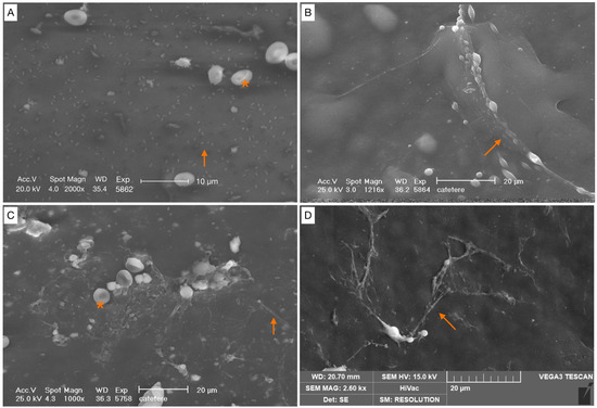 Scattered cocci, immature biofilm (covering < 25% of the specimen surface). (A) Bacterial cells appear irregular, without a matrix covering (orange arrow). (B–D) Cells were arranged either as individual cells, or as short chains with a filamentous projection of extracellular matrix (orange arrows). Red blood cells (*).
