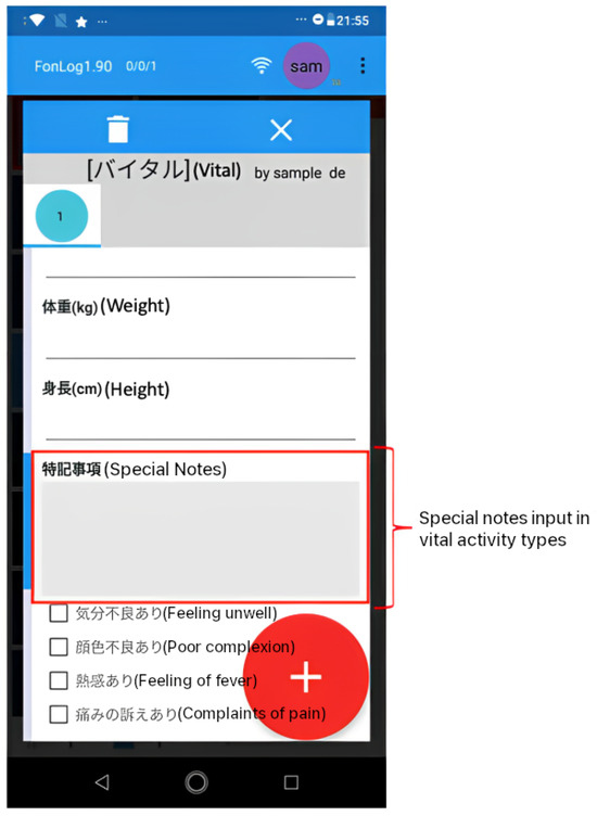 FonLog’s special notes (特記事項) input is intended to capture more elderly information to allow caregivers to report specific patient conditions during activities. Caregivers can provide information in their own words through special notes, which provide a free-form input field. By providing caregivers with sentence suggestions to fill in the special notes, the caregiver’s task will undoubtedly be more efficient and effective regarding time and quality of records. Figure 1 shows the special notes display for the vital activity type, which functions to record extra information about the patient’s vital activity.