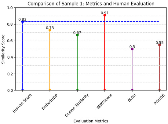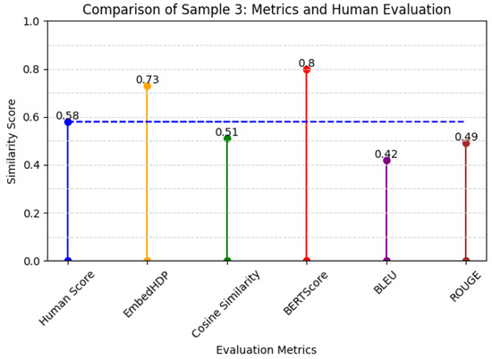 Figure 5 reports the respective scores assigned by humans to the benchmark, EmbedHDP, and several other current evaluation metrics for Sample 3 in Table 7.