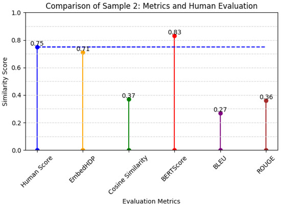 Below, we present human scores as a benchmark compared to EmbedHDP and several other current evaluation metrics for Sample 2 in Table 6.