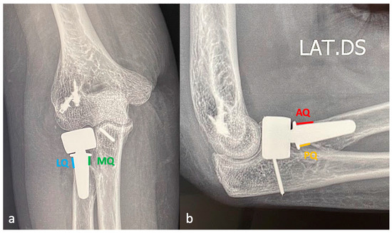 The radial neck was divided into four quadrants according to the standard anatomical position of the human body: the anterior quadrant (AQ), the posterior quadrant (PQ), the medial quadrant (MQ), and the lateral quadrant (LQ) in order to calculate the degree of PRNR. The LQ and MQ were identified in the AP view, while the L view was used to identify the AQ and PQ (Figure 1). The post-operative radiographs were used to evaluate the initial distance between the collar of the prosthetic stem and the cortex of each quadrant. At the last follow-up, PRNR was measured in each quadrant by quantifying the distance between the collar of the prosthetic stem and the endosteal portion of the cortex in each quadrant, since this was the portion that was affected least by PRNR. Subsequently, the mean PRNR (mPRNR) for each patient was calculated by evaluating the arithmetic mean value of the four quadrants.