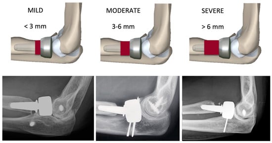 Given these premises, the aim of the present study was to propose a simple quantitative PRNR classification to fill this gap in the current literature. The present study was based on 97 patients who underwent RHA with short press-fit stems and had a mean follow-up of 6 years; approximately 82 of these 97 patients (84%) displayed some degree of PRNR. The patients with PRNR were then stratified into three subgroups (mild, moderate, and severe) according to the degree of PRNR. We considered an mPRNR <3 mm as mild, an mPRNR between 3 and 6 mm as moderate, and an mPRNR > 6 mm as severe. The 3 mm cut-off was chosen on the basis of the anatomical distance (normally ranging from 8 to 9 mm [7,8]) between the lower margin of the radial head articular surface on its ulnar side, which corresponds to the lesser sigmoid notch, and the proximal margin of the bicipital tuberosity (i.e., the length of the radial neck). According to the data in the present study, 54% of the sample presented a moderate mPRNR value (3–6 mm) and 33% presented a mild mPRNR value. A severe mPRNR was observed in only 13% of the sample, which indicates that more severe forms of PRNR are relatively rare. When the number of radial neck quadrants involved in PRNR was considered, 6% of the patients with mild mPRNR displayed resorption in one quadrant, 18% displayed resorption in two quadrants, 4% displayed resorption in three quadrants, and 72% displayed resorption in four quadrants. All four quadrants were instead always involved in all of the patients with moderate or severe mPRNR, which highlights the circumferential nature of PRNR in all but the lower grades.
