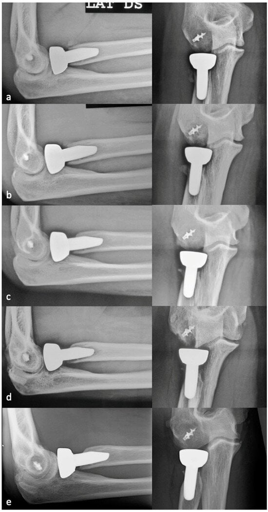 - Giannicola, G.; Amura, A.; Sessa, P.; Prigent, S.; Cinotti, G. Assessment of progression and clinical relevance of stress-shielding around press-fit radial head arthroplasty. Bone Jt. J. 2023, 105, 905–911. [Google Scholar] [CrossRef] [PubMed]