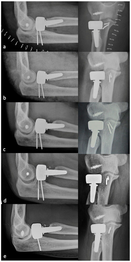 No implant-related complications were detected at the last radiographic evaluation. No patients underwent reintervention during the follow-up owing to stem failure-related complications. Three patients suffered a disassembly of a bipolar prosthesis 4, 5, and 10 years after the index procedure following a new trauma. In the first patient, the radial head component was replaced and the LCL was reconstructed. In the second and third patients, the disassembly was associated with capitellar fracture; these two cases both underwent osteosynthesis with two headless screws and replacement of the radial head component. The mPRNR was moderate in one of these three patients, severe in another, and moderate in the last. The stem appeared to be well integrated in all three cases, with no need for revision (Figure 5).