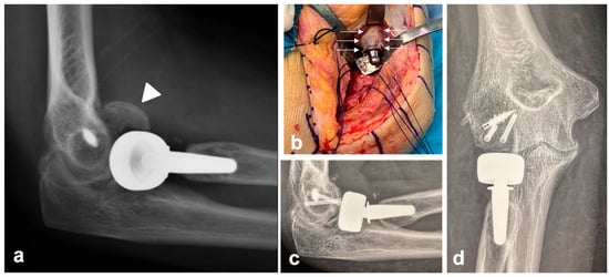 Clinical case of a patient who experienced disassembly of a bipolar prosthesis 10 years after the index procedure following a new trauma. The disassembly was associated with a capitellum fracture (white arrowhead) (a); the mPRNR in this patient was moderate. The stem appeared to be well integrated, with no need for stem revision (b). The intraoperative appearance of PRNR is also shown in (b) (white arrows). Osteosynthesis with two headless screws and replacement of the radial head component were performed (c,d).