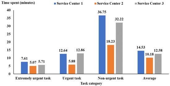 The findings indicated that regardless of the service category under consideration, Service Center 2 was found to have the best performance in the shortest time. In contrast, Service Center 1 experiences the most significant room for improvement, demonstrating the worst performance, and Service Center 3 falls in the middle. When we calculate the average time (95% CI) across these three categories, Service Center 1 averages 14.53 (95% CI: 14.42 to 14.64) minutes, Service Center 2 excels with an average of 10.18 (95% CI: 10.04 to 10.32) minutes, and Service Center 3 demonstrates efficiency with an average of 12.58 (95% CI: 12.35 to 12.81) minutes. This data highlights the importance of reducing the time it takes to start tasks across all service categories, as shorter times lead to better operational efficiency and quicker service.