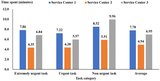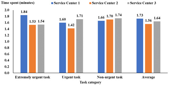 Figure 2 shows the duration between task dispatch by the service center and task receipt by service personnel, which was 1.73 (95% CI: 1.72 to 1.74), 1.56 (95% CI: 1.53 to 1.59), and 1.64 (95% CI: 1.60 to 1.68) minutes for Service Centers 1, 2, and 3, respectively. Service Center 2 generally had the best performance (Figure 2). Figure 3 also shows that the duration between task receipt and arrival at the service location was 4.94 (95% CI: 4.89 to 4.99) minutes for service personnel from Service Center 2, shorter than Service Centers 1 and 3 (more than 6 min).