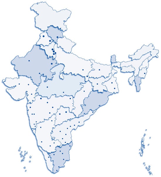 To meet the global targets of ending HIV in India, the National AIDS Control Organization (NACO) has come up with policies to reduce annual new infections and mortality by 80% by 2025–2026 through promoting universal access to quality services like viral load testing facilities to people in need of ART [3]. According to the NACO, MoHFW, the Government of India estimates, India is the third largest burdened country, with 24.1 Lakh people living with HIV and 620 anti-retroviral treatment centers and 1264 linked centers under NACP policy. These centers cater antiretroviral therapy to 1,494,000 PLHIV across the country. As per the latest NACO reports, there is a need for enhancement in ART coverage and viral load expansion in the country [9,10]. Currently, there are 64 public-sector viral testing laboratories operating under the National AIDS Control Program (Figure 1). Recognizing the importance of proficiency testing as a fundamental component of a comprehensive laboratory quality assurance program, the Indian Council of Medical Research-National AIDS Research Institute (ICMR-NARI) in Pune has been designated as the Apex laboratory responsible for conducting the nationwide HIV-1 viral load (VL) proficiency testing (PT) program. This initiative aims to enhance viral testing facilities across the country.