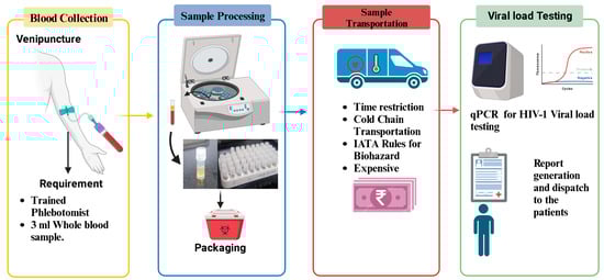 The conventional method of HIV-1 viral load testing primarily relies on quantifying the amount of HIV-1 RNA in a patient’s plasma, providing a crucial indicator of the viral replication activity within the body (Figure 2). This process involves the collection of a venous blood sample from the patient. The collected blood is then transported under controlled conditions to a diagnostic laboratory, where specialized equipment, such as real-time polymerase chain reaction (PCR) machines, is utilized. PCR amplifies the viral RNA in the sample, enabling precise quantification. The process requires technical expertise and an established infrastructure of laboratories. Moreover, cold-chain logistics are crucial to maintaining the integrity of the plasma samples during transportation, adding to the complexity and cost of the conventional method. Despite being the established gold standard, the conventional approach has limitations, especially in resource-limited settings, due to its demanding infrastructure requirements, cost, and dependence on a well-developed healthcare system.